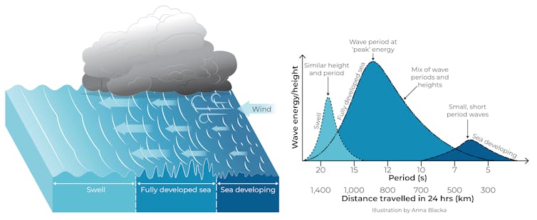 But very large storms with high, sustained winds can generate waves with periods of more than 20 seconds. These waves travel much faster, over 100km per hour in the open ocean, and their energy (which travels more slowly than individual waves) can cover 1,500km in 24 hours.