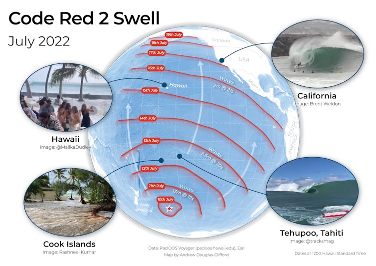 The “Code Red 2” swell was a good example of this in action. It was generated by a massive storm system southeast of New Zealand in July 2022. The “significant wave height”, or average of the largest third of the system’s waves, reached 13 metres. Individual waves were up to twice this height.