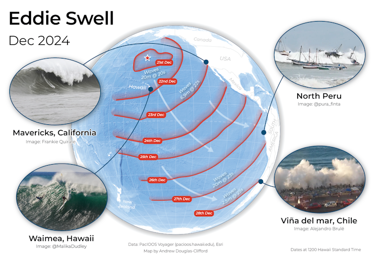 More recently, the 2024 “Eddie” swell was generated from an extremely intense low pressure system in the North Pacific in December 2024. Waves near the centre of the storm reached heights of 20 metres, with a 22-second period.