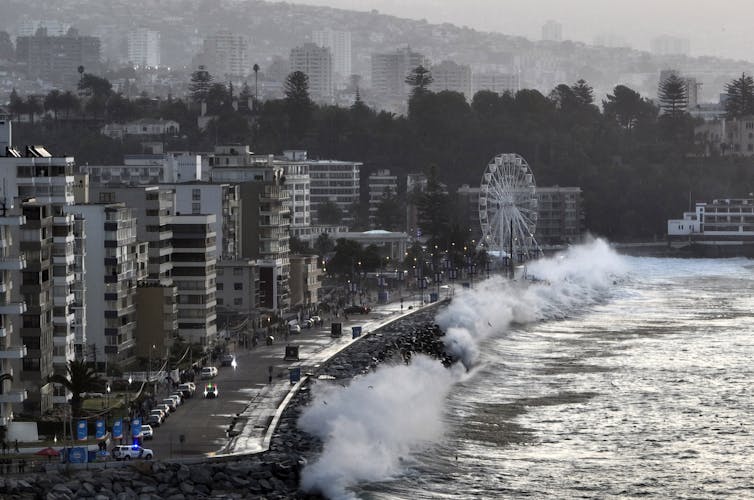 Due to its very long period, the swell was able to continue southward, still with a lot of energy. It reached the north coast of Ecuador and Peru, 8,500km from where it began, where it destroyed fishing boats. And it finally hit Chile, 11,000km from its source, where it closed ports and inundated coastal promenades.