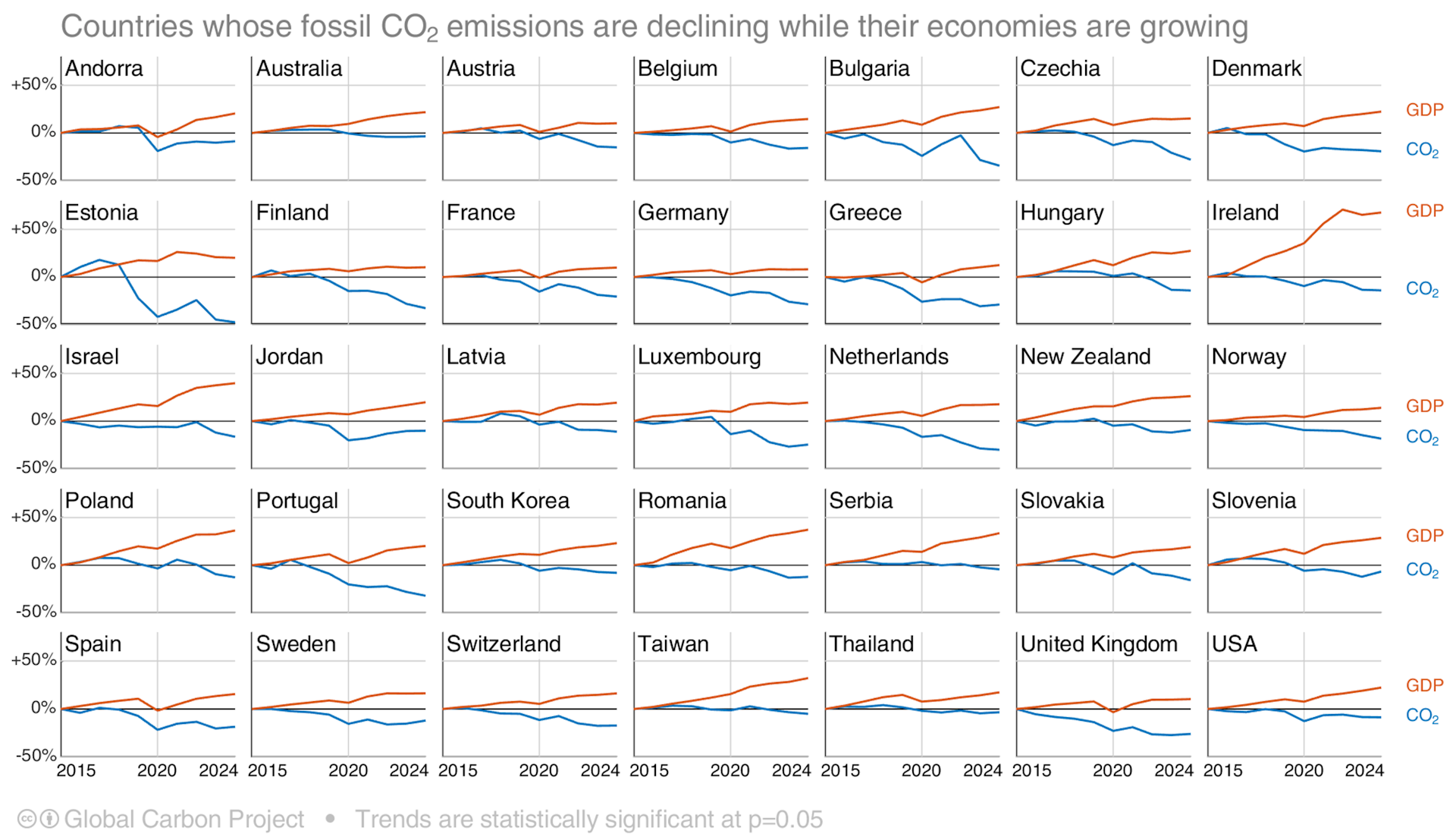 Our improved and updated global carbon budget shows the relentless global increase of fossil fuel CO₂ emissions. But it also shows detectable and measurable progress towards decarbonisation in many countries.